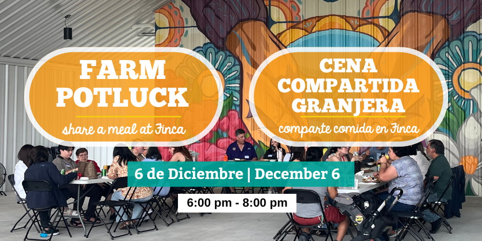¡Únase con nosotros para nuestra cena compartida de fin de año para cerrar un año muy memorable en la nueva granja! Traiga una comida para compartir con los vecinos mientras disfruta una tarde fresca de diciembre entre comunidad. La granja proporcionará los platos, cubiertos, y bebidas. Por favor traiga una lista de ingredientes en su comida.
