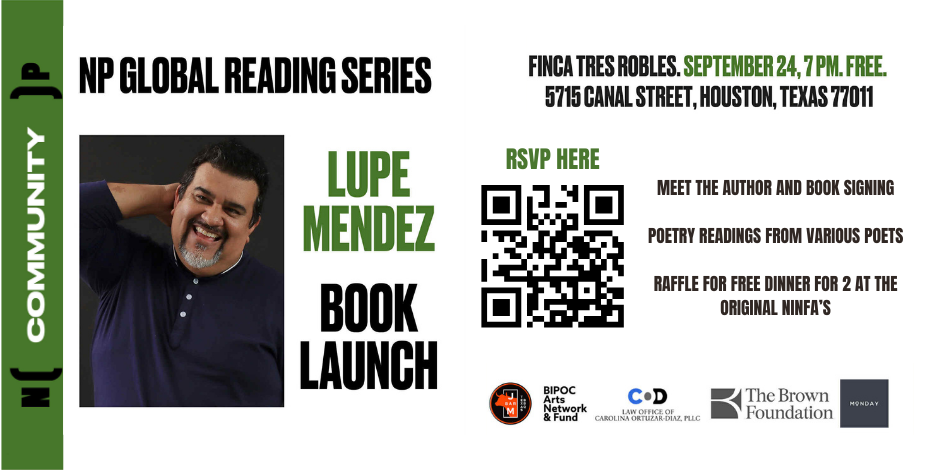 ​Meet award-winning poet Lupe Mendez as he presents his new book PRAYER HOLDING NIGHT: NEW AND SELECTED POEMS as part of the NP Global Reading Series, brought to you in part by the Brown Foundation. This is a Big Read Kick-Off Session. Free admission. Order exclusive signed copies at www.NuestraPalabra.org.