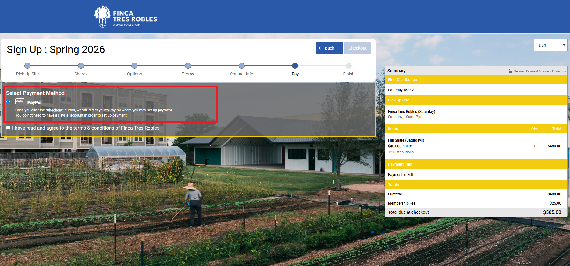 Select PayPal as your payment method and click “Checkout” (reference included screenshot of CSA Registration Page).